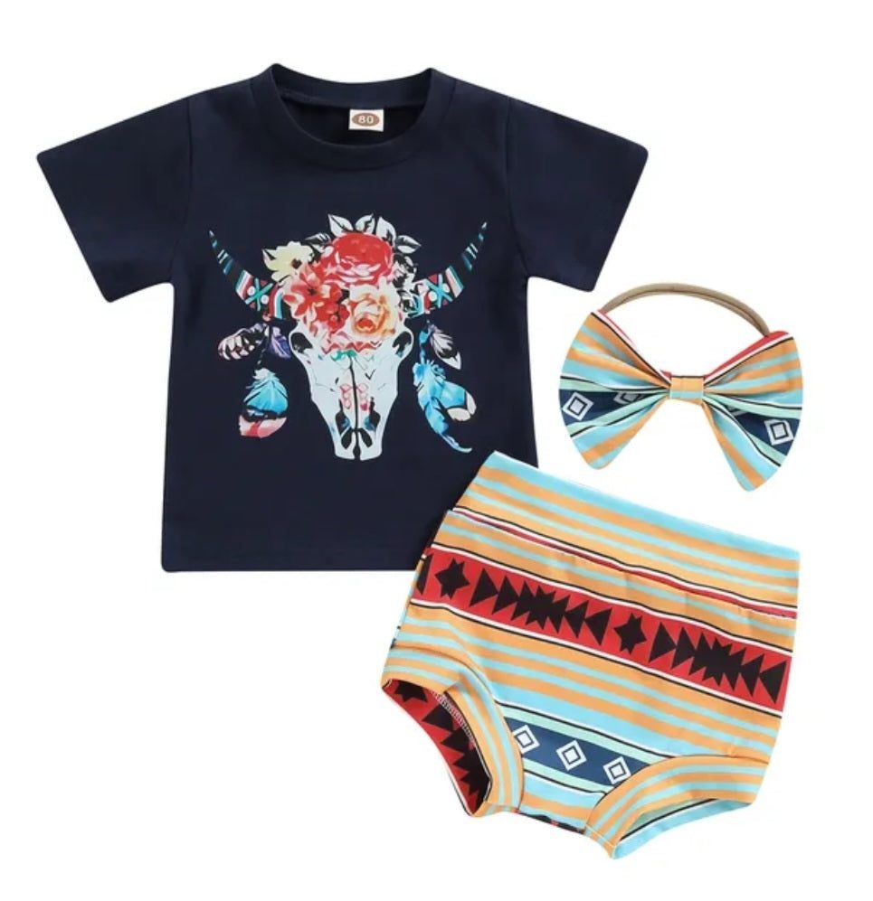 Navy Boho Cow Skull T-shirt, Bloomer, and Headband.