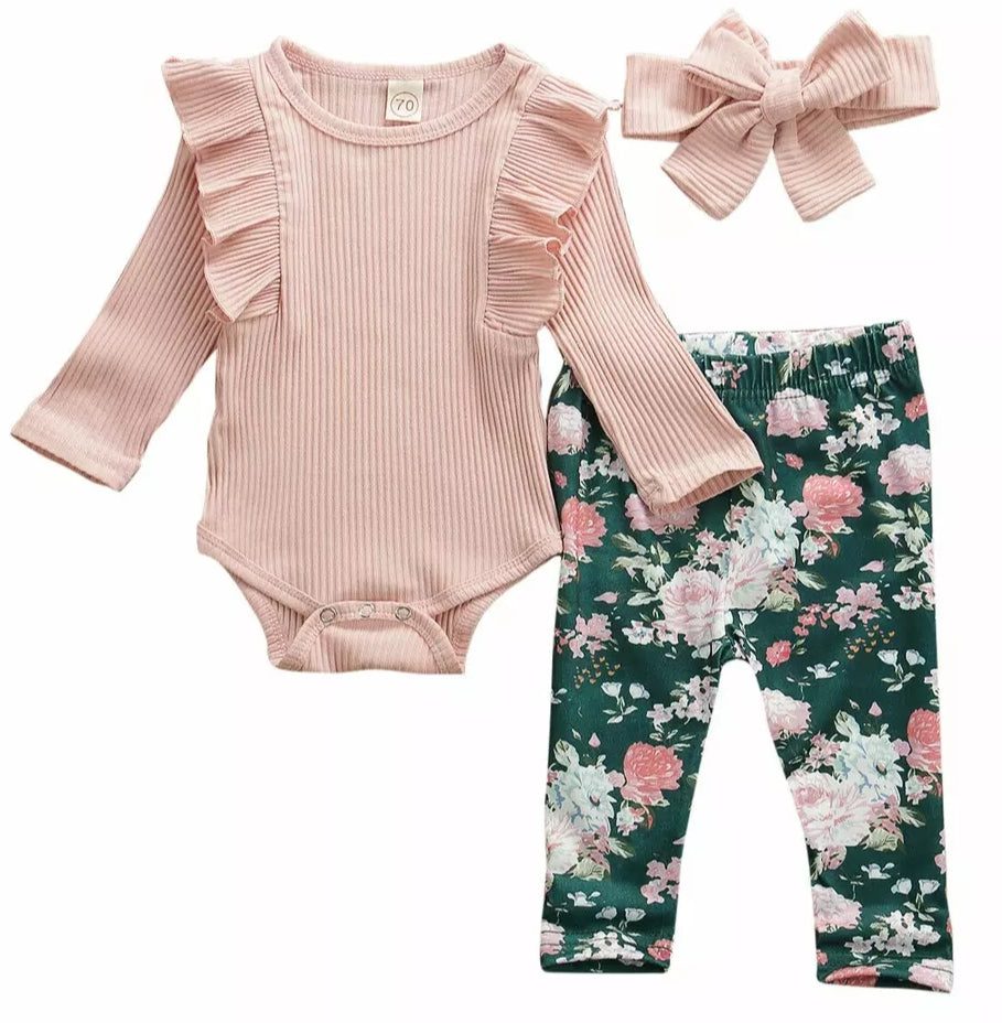 Ribbed Dusty Pink Ruffle Romper Set with Floral Leggings and Headband